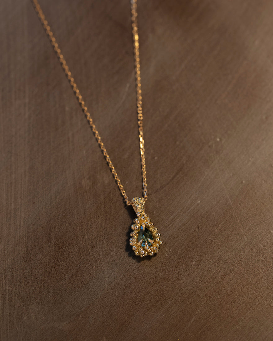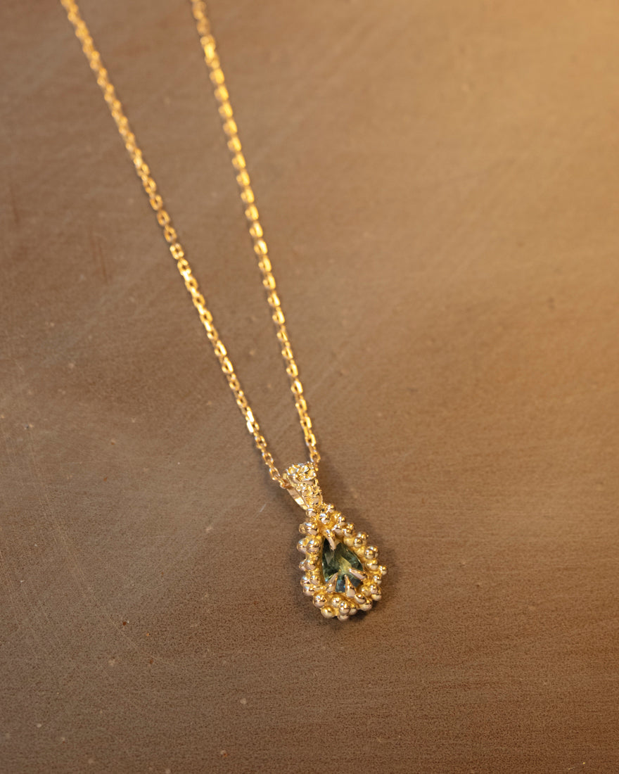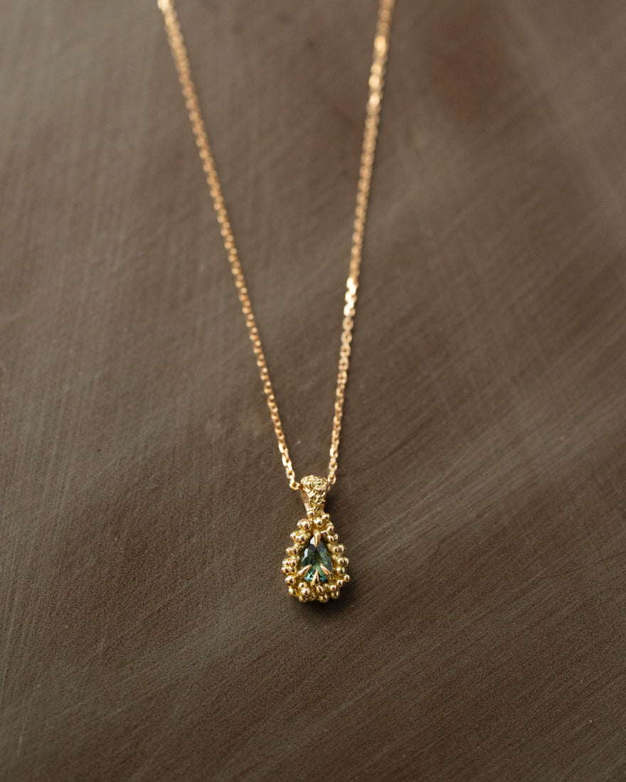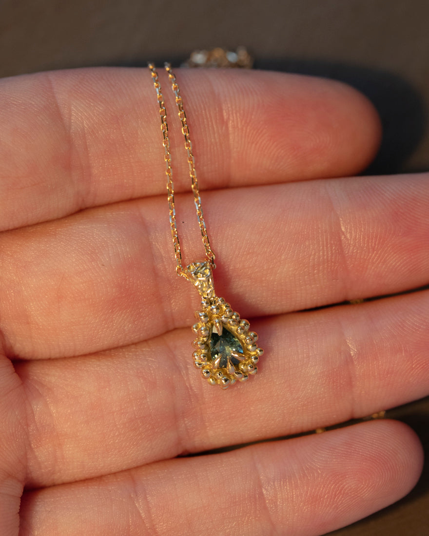 Handmade pendant inspired by our popular Lily ring, made with a forest green pear shaped Australian sapphire. Made in in 18k yellow gold.