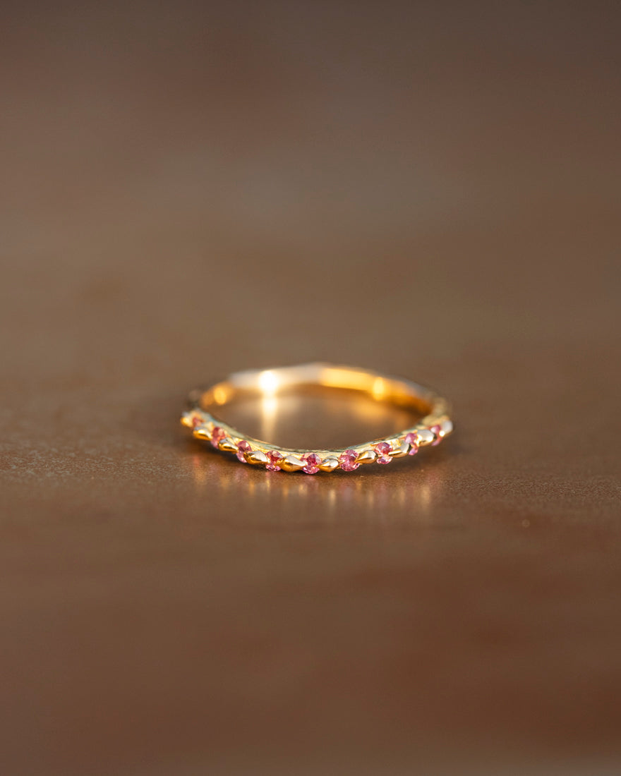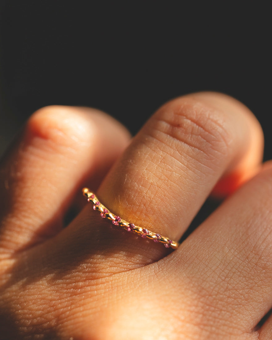 Thin curved sapphire lathyrus ring with cast in place brilliant cut sapphires, made in 18K Yellow Gold in our Lava texture. Set with our drop set style.