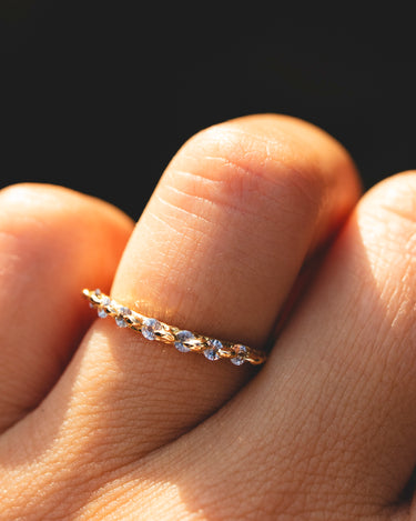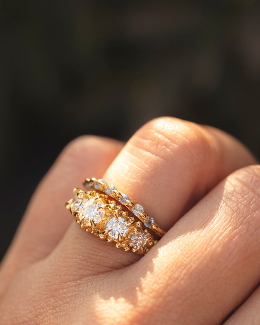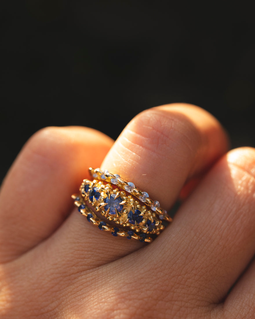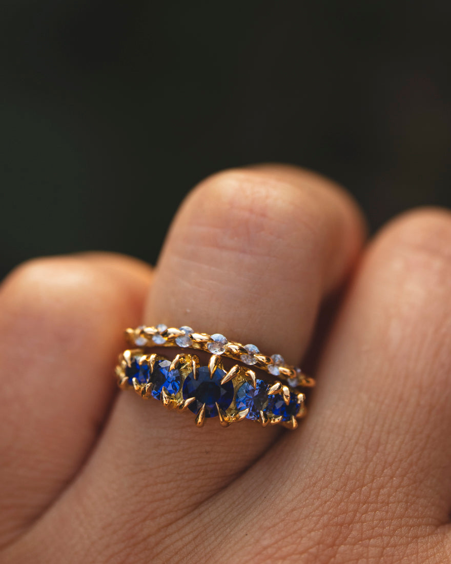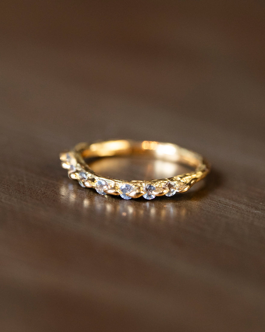 Thin curved sapphire Lathyrus ring with cast in place brilliant cut sapphires, made in 18K Yellow Gold in our Lava texture. Set with our drop set style.