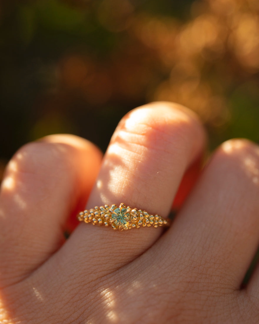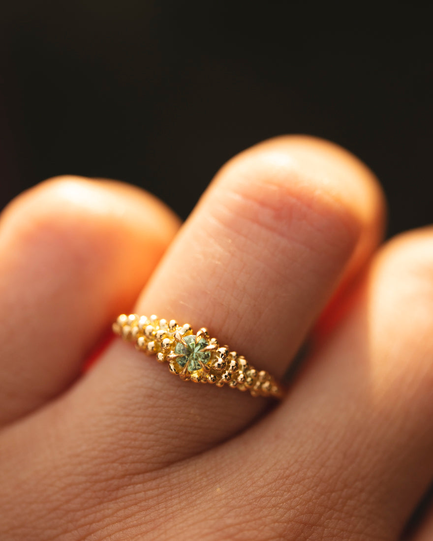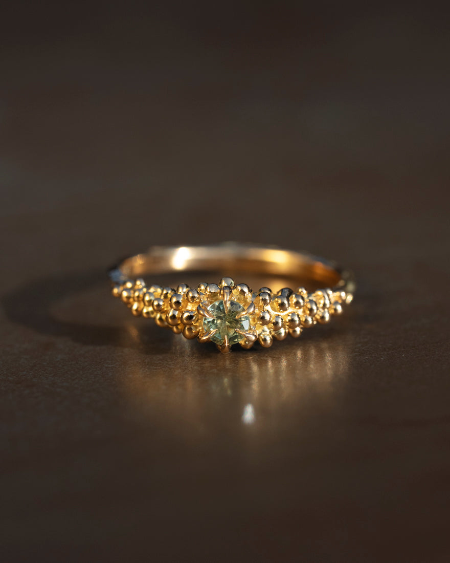 Lily Bud sapphire ring, with granules around the sapphire, made with my Pine texture, and a brilliant cut sapphire, made in 18K Yellow Gold.