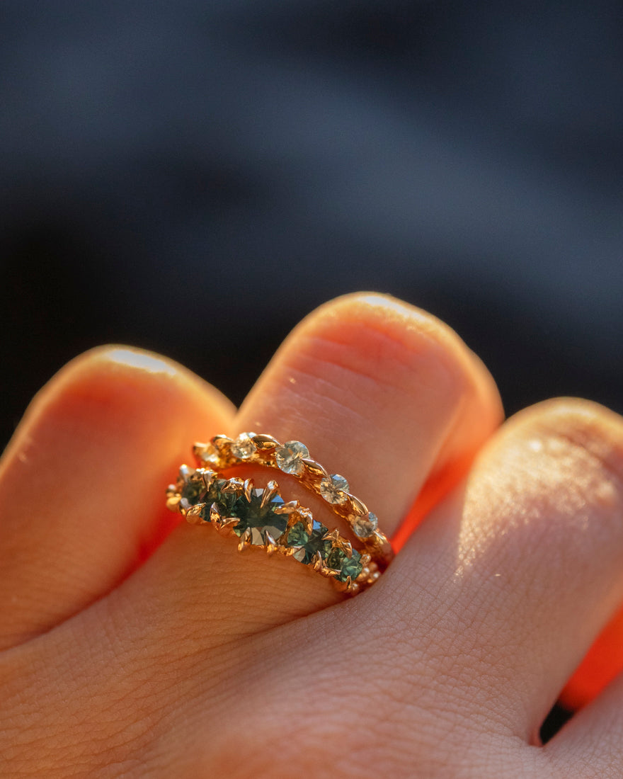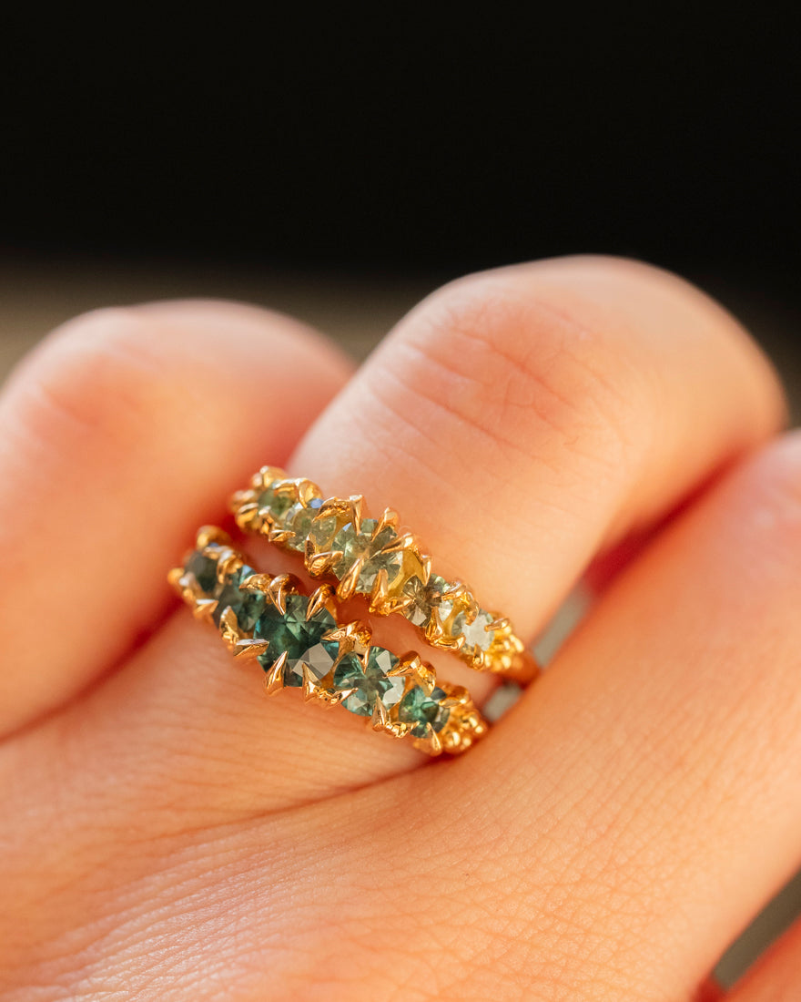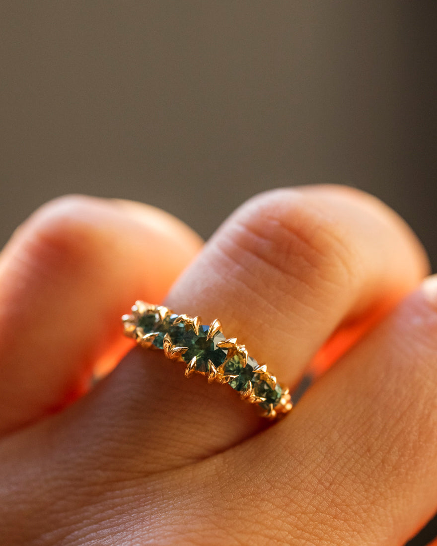 Clarkia cluster ring, is a five stone sapphire ring where the gemstones descend in size from the center, the sapphires are cast in place creating a truly unique ring every time. The ring is set with our big claws and features granules on the end sides of the ring with a round ring band in our Lava texture.