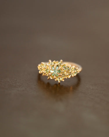 Lily bloom cluster ring is based on our popoular Lily ring, here with sapphires all around the center stone. Made with Lava textured ring band and brilliant cut sapphires, in 18K Yellow Gold.