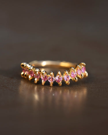 Claw set curved sapphire claw ring, with brilliant cut pink sapphires, made in 18K Yellow Gold.