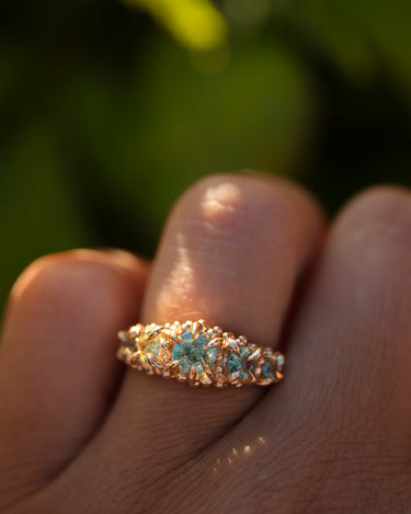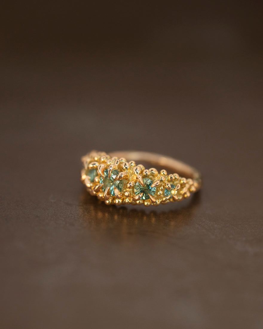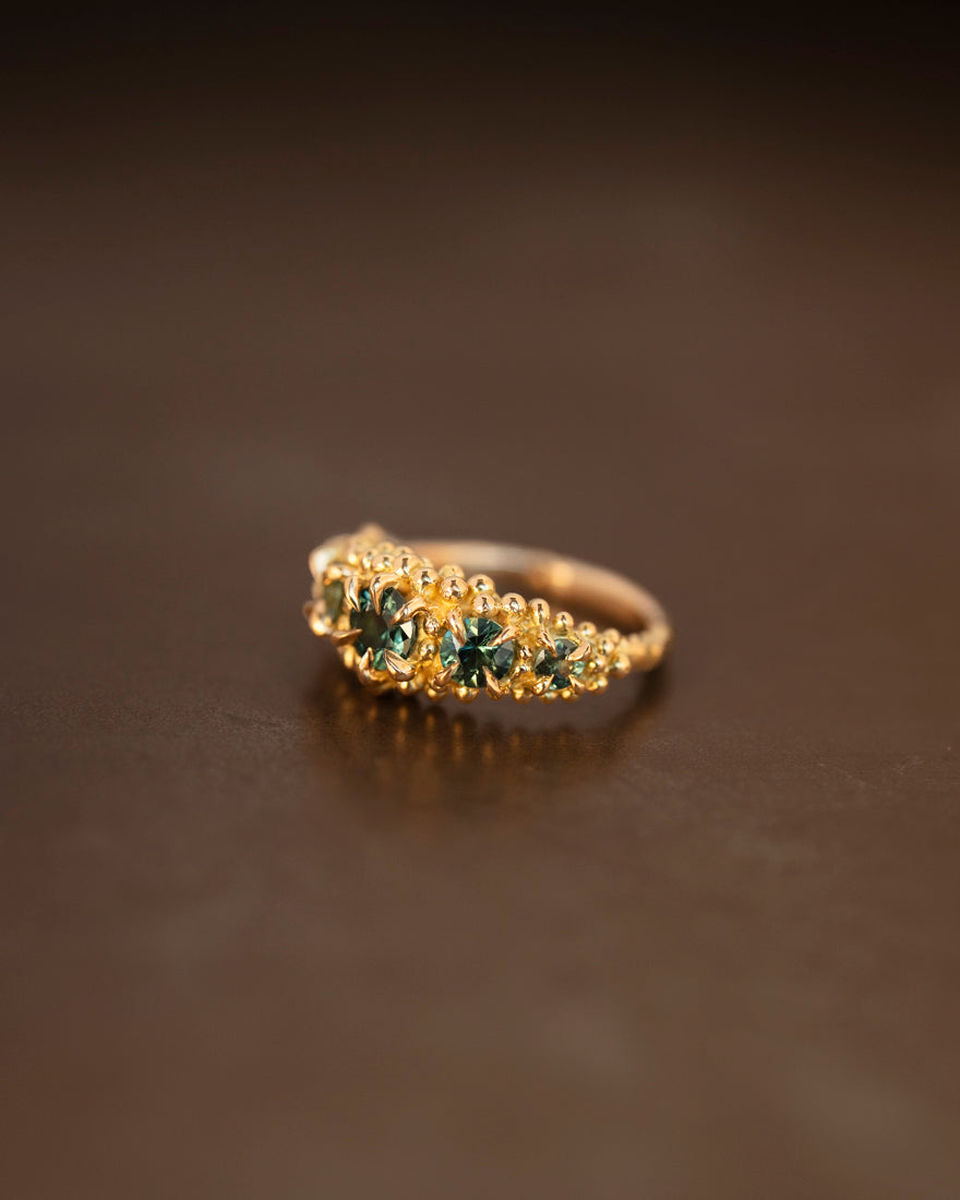 Iberis cluster ring, is a five stone sapphire ring where the gemstones descend in size from the center, the sapphires are cast in place creating a truly unique ring every time. The ring features granules all around each gemstone with a round ring band in our Lava texture.