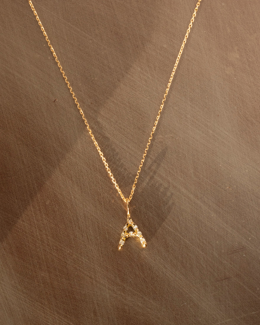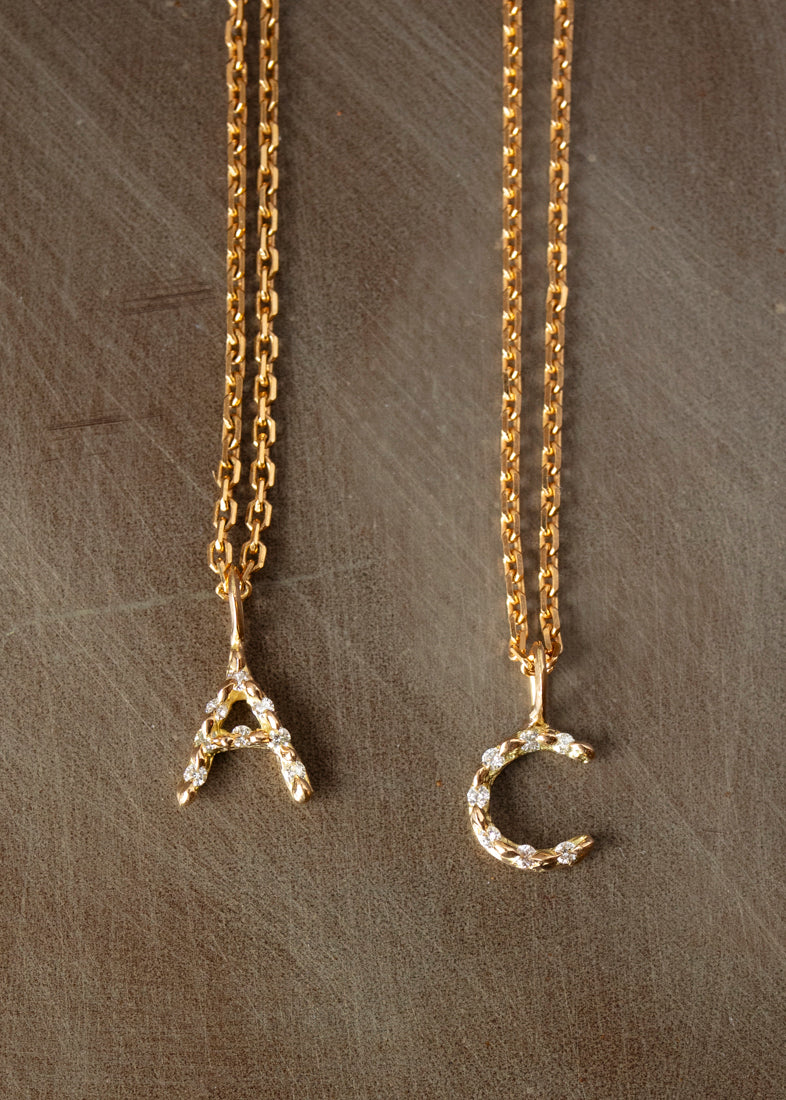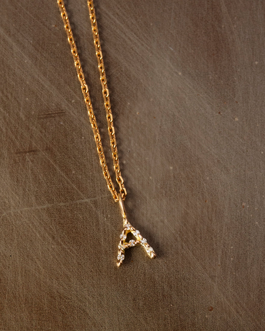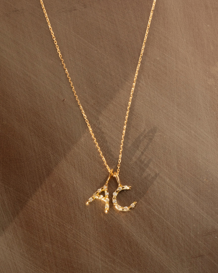 Handmade letter with cast in place brilliant cut diamonds. Made in 18k yellow gold.
