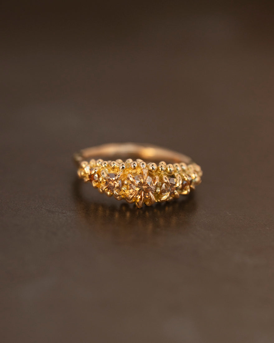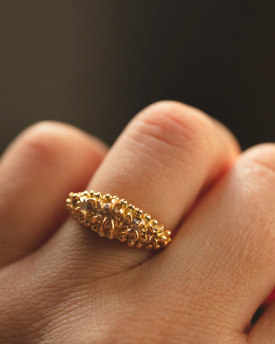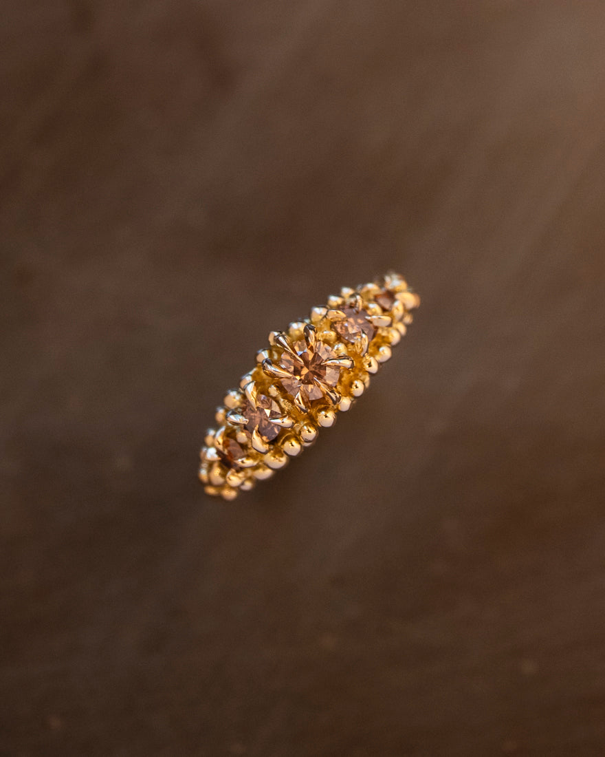 Iberis Diamond ring, is a five stone diamond ring where the diamonds descend in size from the center, the diamonds are cast in place creating a truly unique ring every time. The ring features granules all around each diamond with a round ring band in our Pine texture.