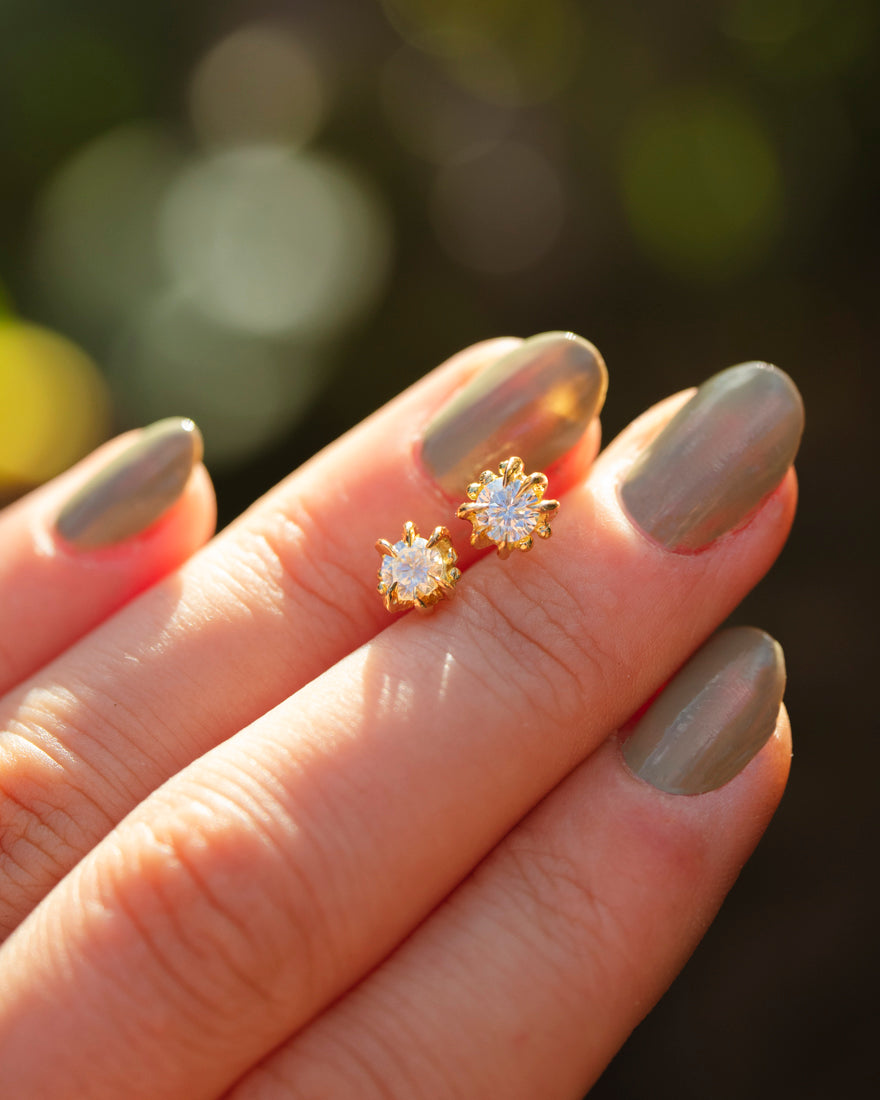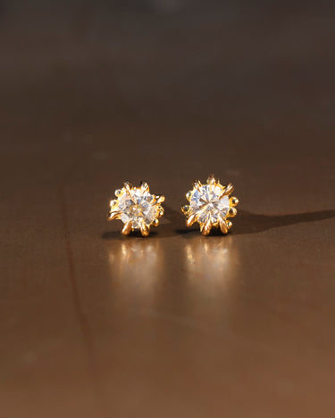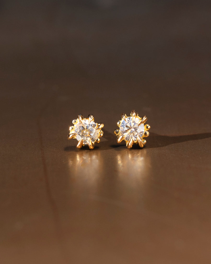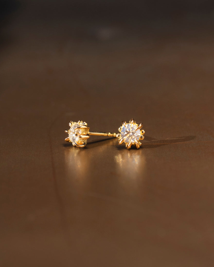 Handmade Clarkia stud diamond earrings, made in recycled 18K yellow Gold where each earring is inspired by our popular Clarkia ring with the original talon claws and granules on each side.
