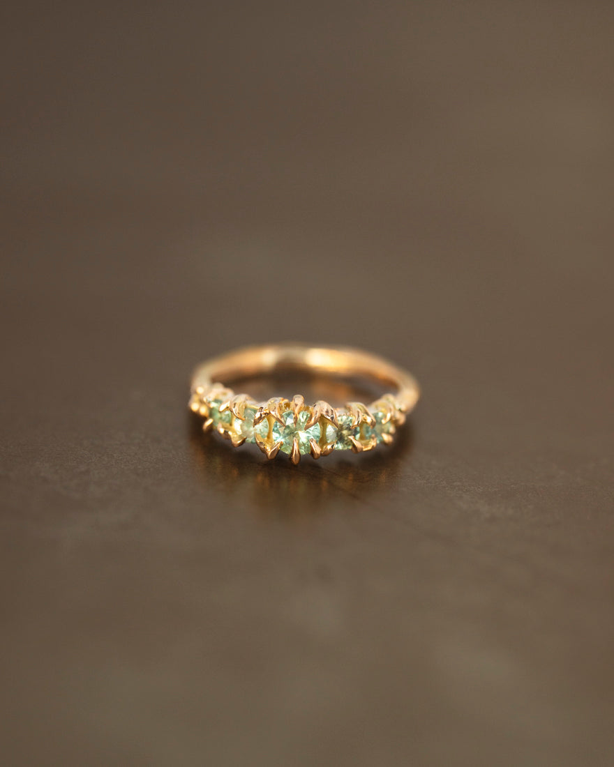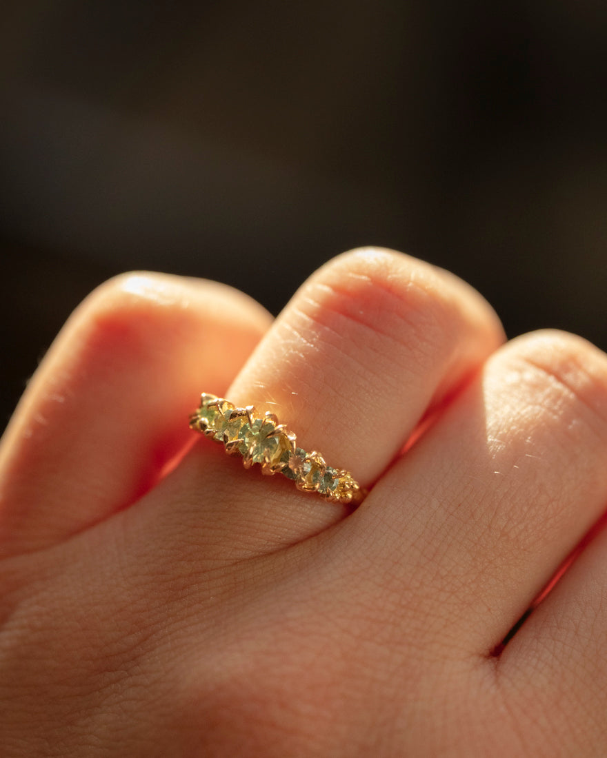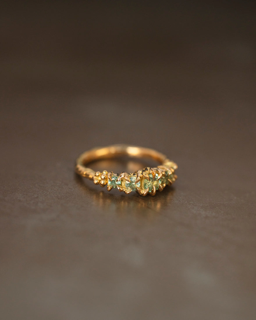 Clarkia cluster ring, is a five stone sapphire ring where the gemstones descending in size from the center, the sapphires are cast in place creating a truly unique ring every time. The ring is set with our big claws and features granules on the end sides of the ring with a round ring band in our Lava texture.