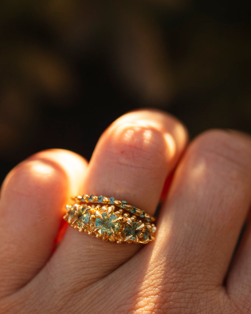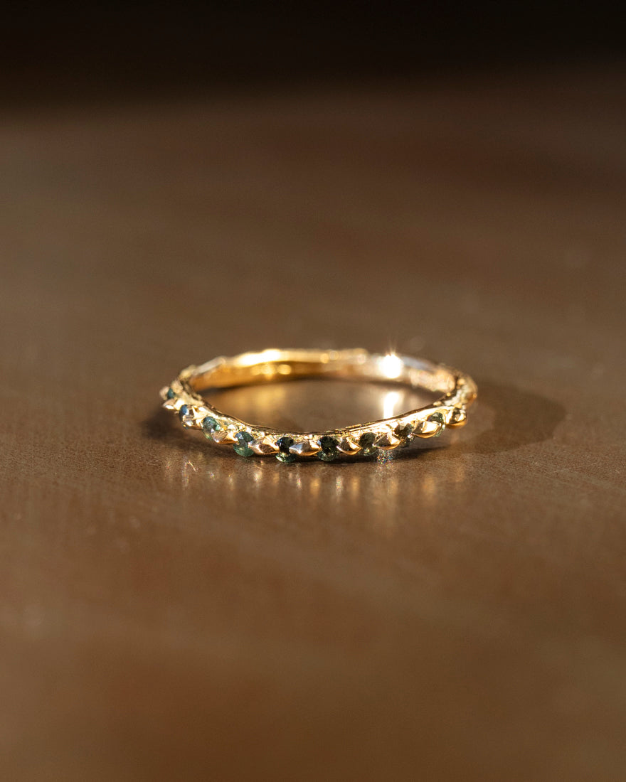 Thin curved Lathyrus ring with cast in place brilliant cut dark green sapphires, made in 18K Yellow Gold in our Lava texture. Set with our drop set style.