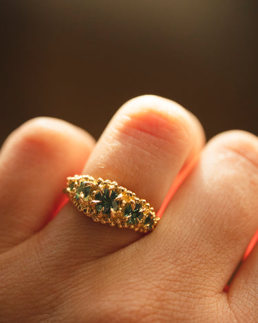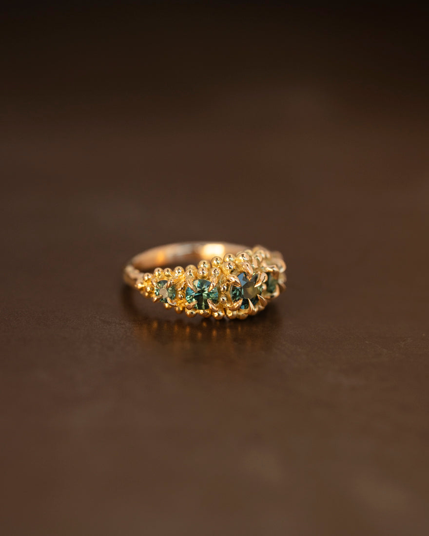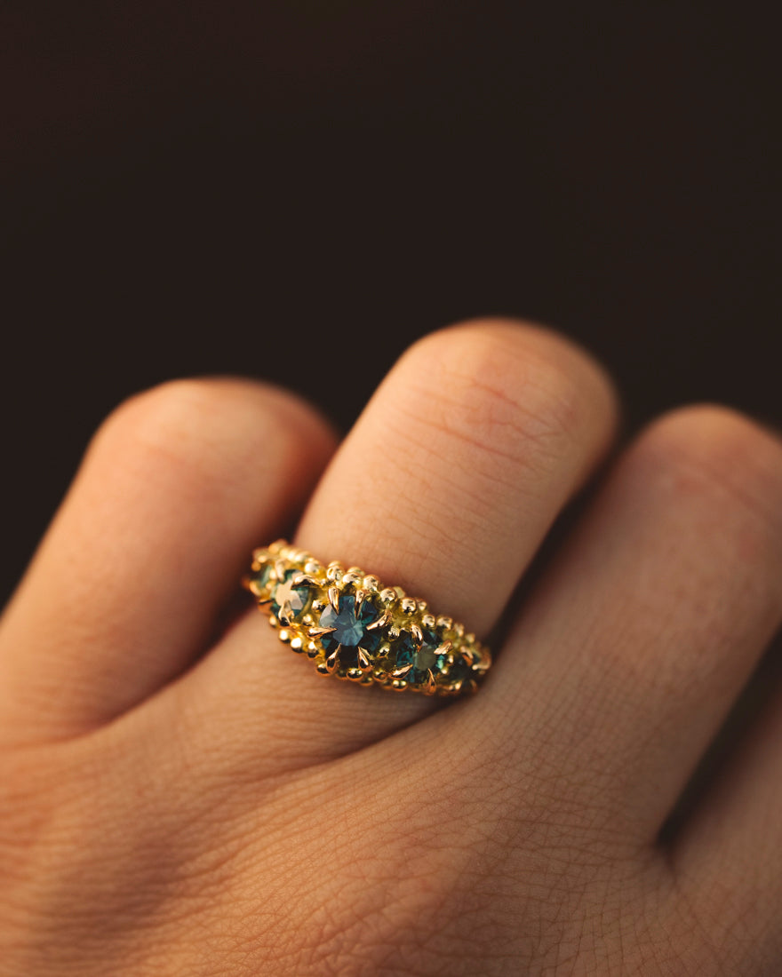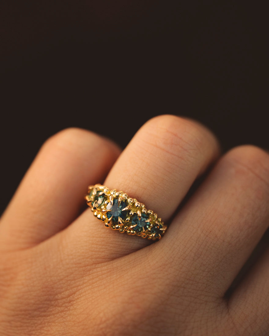 Iberis cluster ring, is a five stone ring where the gemstones descend in size from the center, the sapphires are cast in place creating a truly unique ring every time. The ring features granules all around each gemstone with a round ring band in our Lava texture. Made in 18k yellow gold.