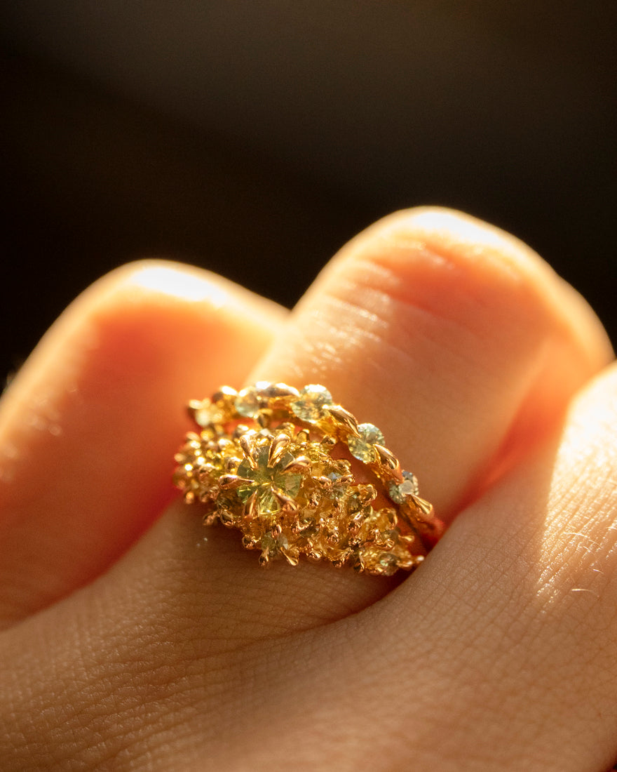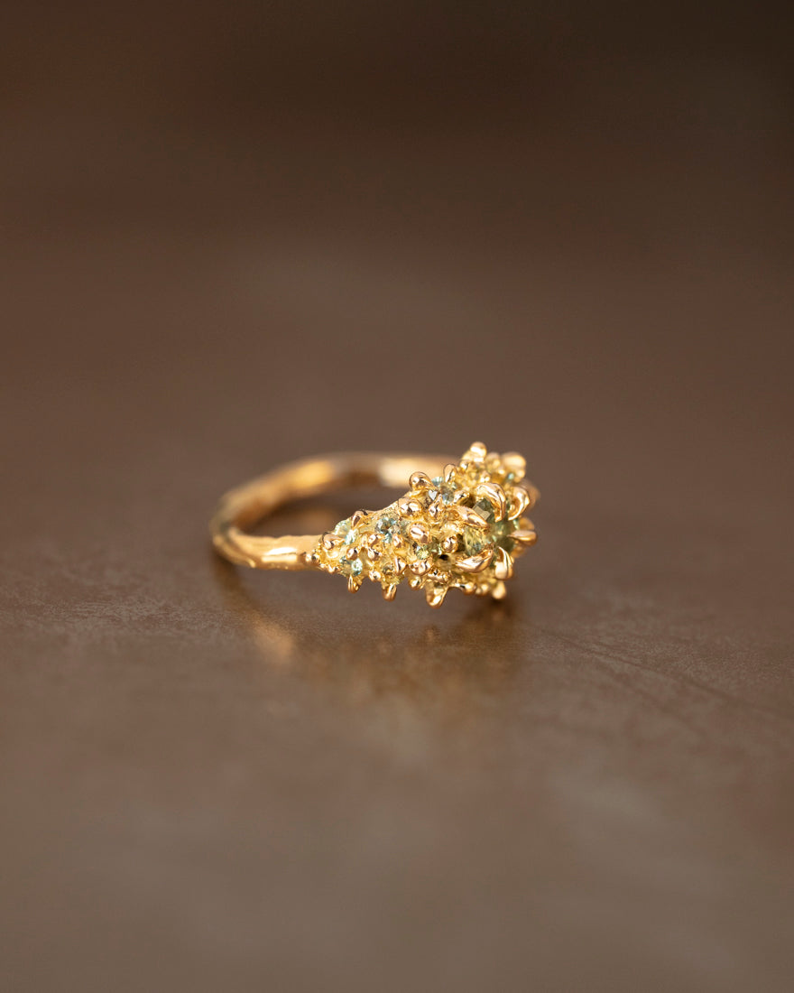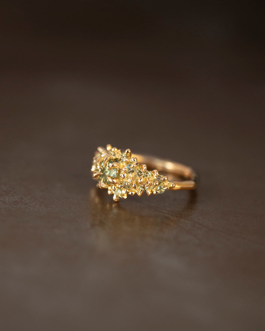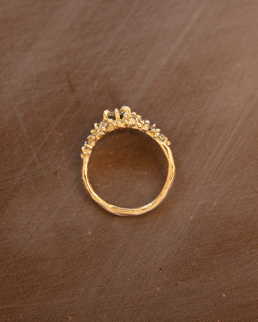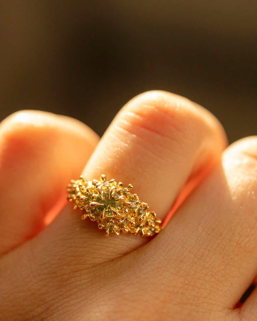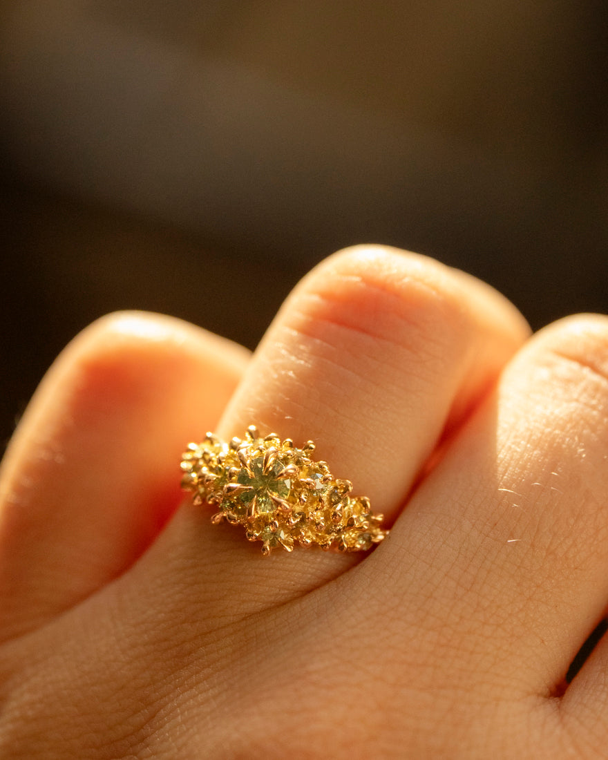 Lily bloom cluster ring is based on our popoular Lily ring, here with sapphires all around the center stone. Made with Lava textured ring band and brilliant cut sapphires, in 18K Yellow Gold.