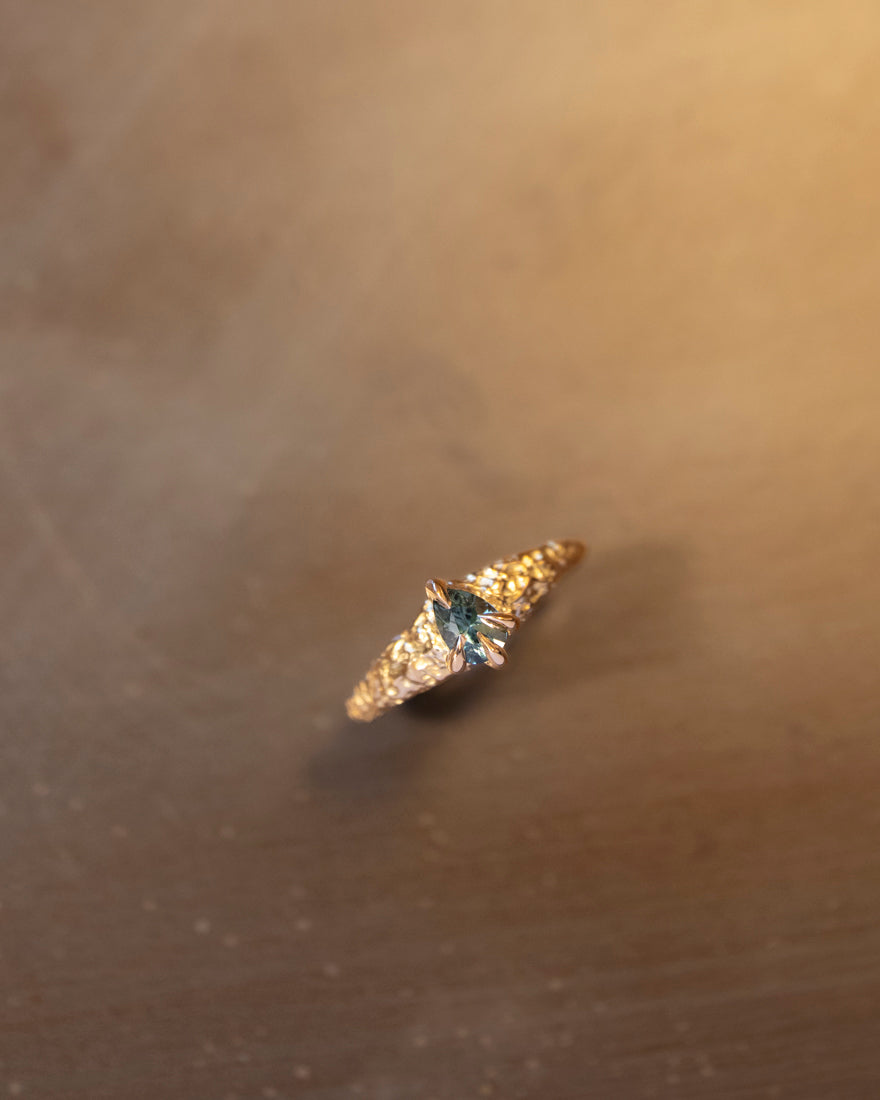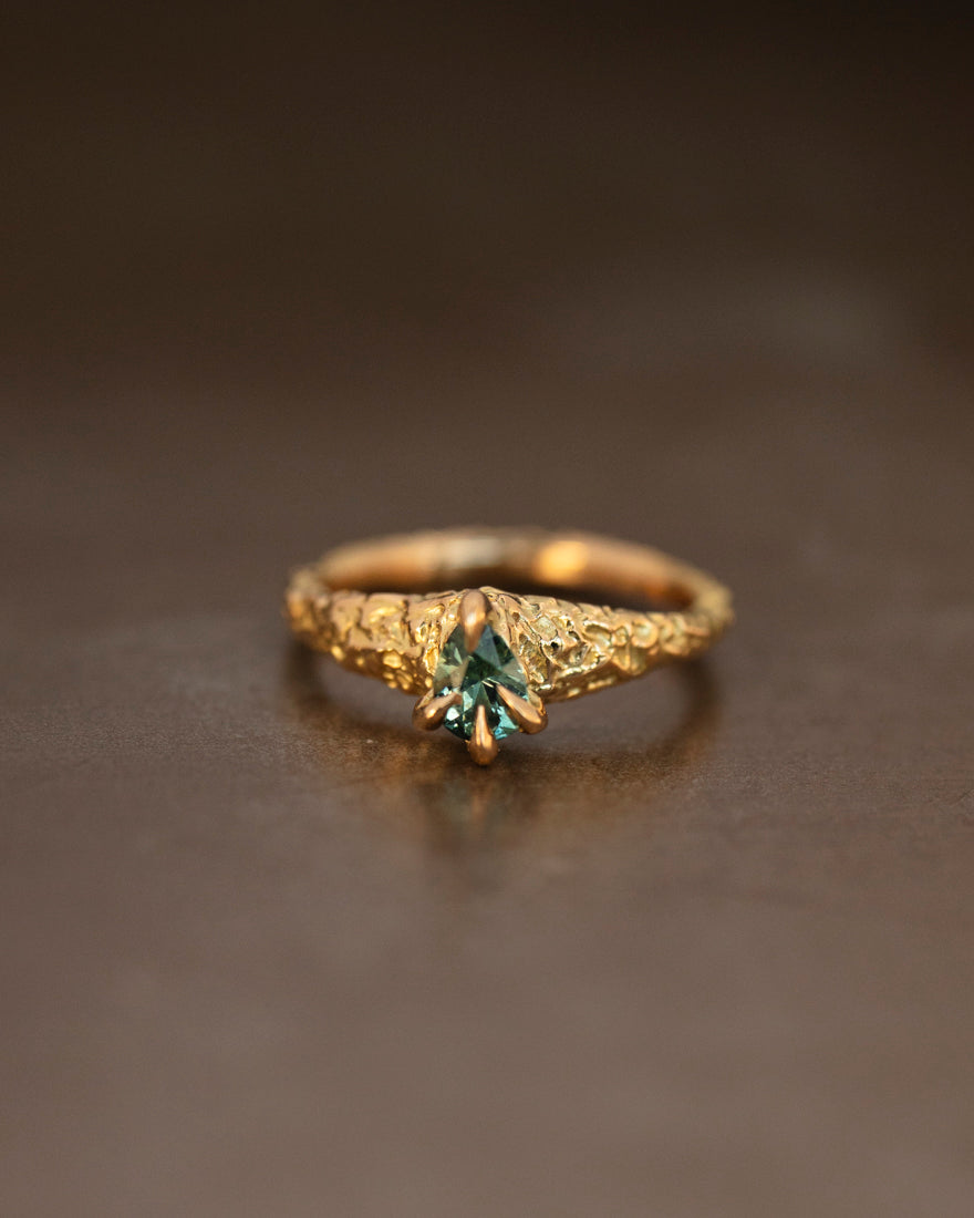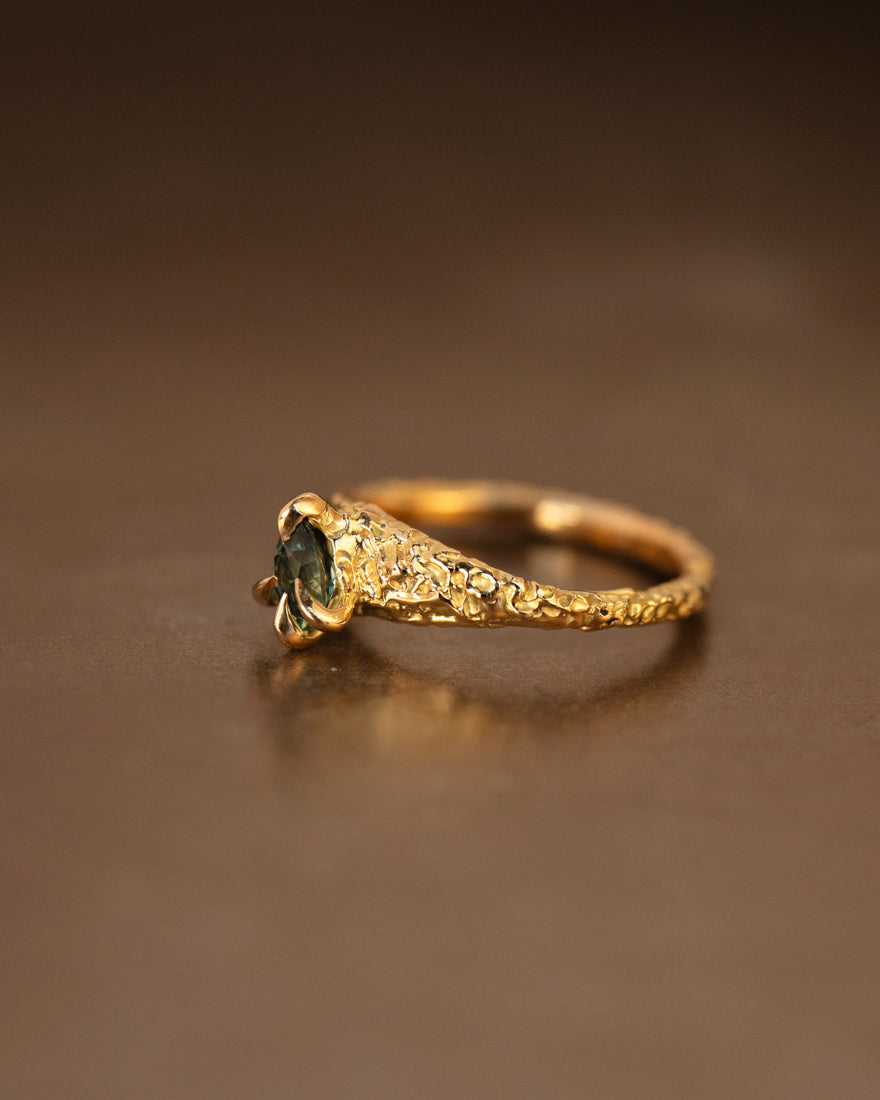 A dreamy Tulip ring with pear shape brilliant cut dark green sapphire, 0.53ct, made in 18K Yellow Gold. The sapphire is cast in place in our talon claw style.
